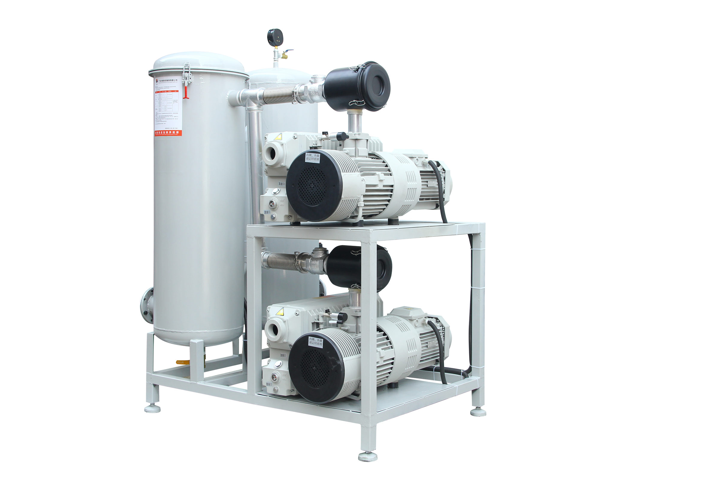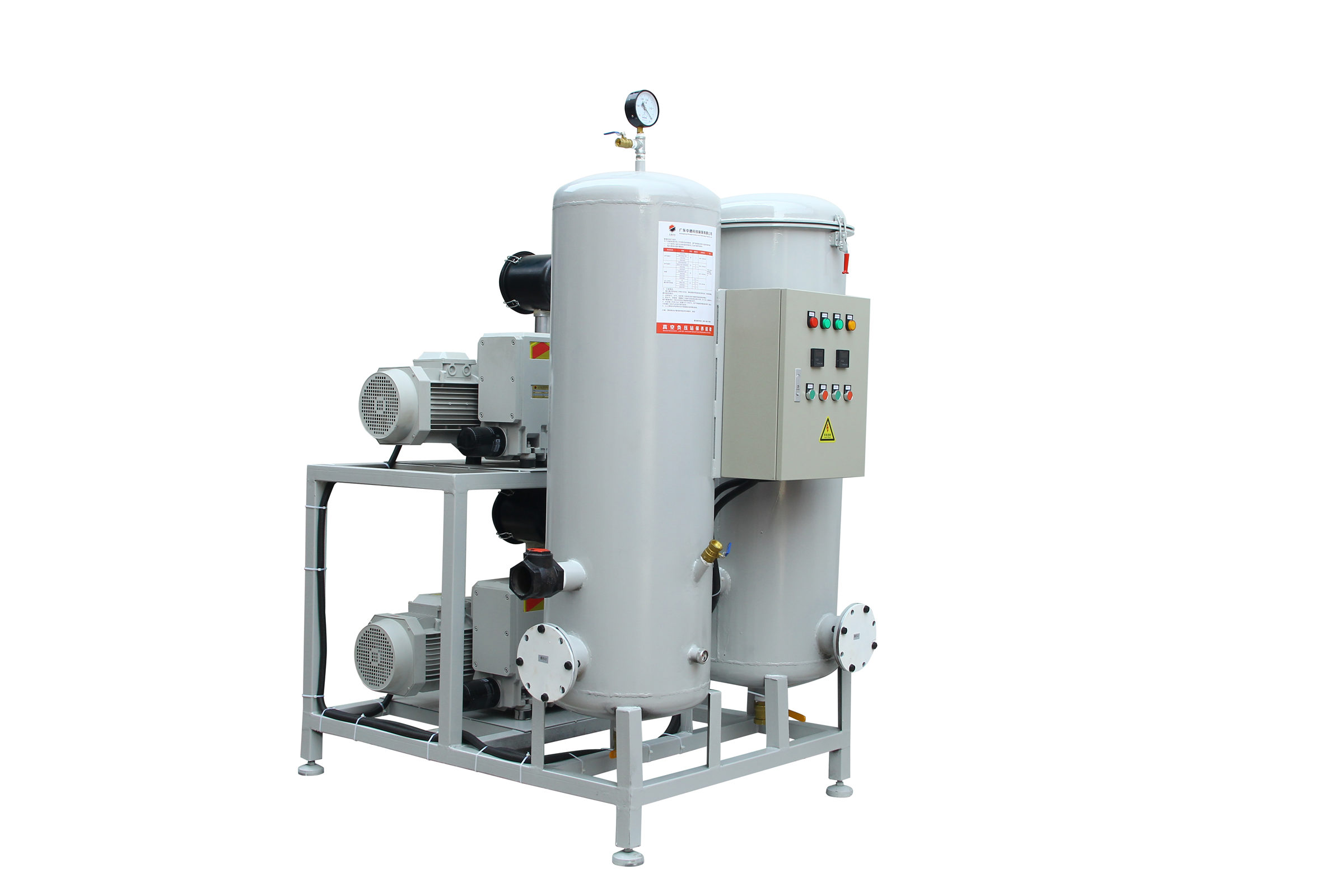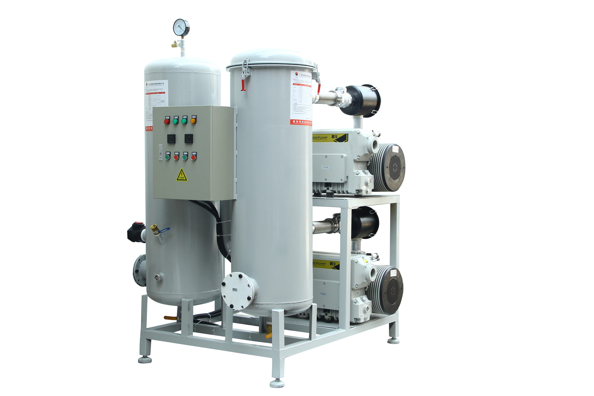 固定式系統一般包括底盤基座、真空泵、真空緩沖罐、控制箱、真空附件(真空閥、真空管道真空過濾器等)、真空度控制系統組成,一般適合抽氣量大,工作條件苛刻等工況例如;3立方真空負壓站,配置2臺302立方真空泵,真空過濾器組,在自動控制模式下瞬間抽氣速度可達上干立方每小時時,遠大于單泵和雙泵直接抽氣的速度。